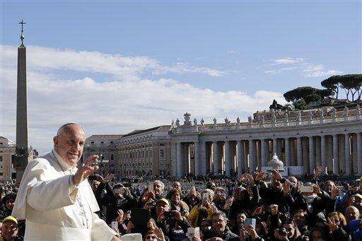 Pope Francis waves to faithful upon his arrival to attend a Jubilee audience in St. Peter's Square, at the Vatican, Saturday, Nov. 12, 2016. (AP Photo/Gregorio Borgia)