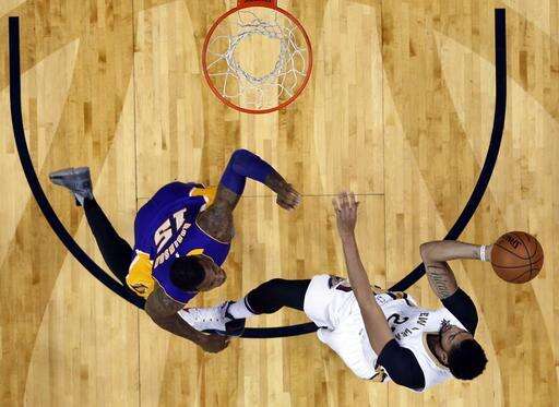 New Orleans Pelicans forward Anthony Davis (23) goes to the basket against Los Angeles Lakers forward Thomas Robinson (15) in the first half of an NBA basketball game in New Orleans, Saturday, Nov. 12, 2016. (AP Photo/Gerald Herbert) The Associated Press