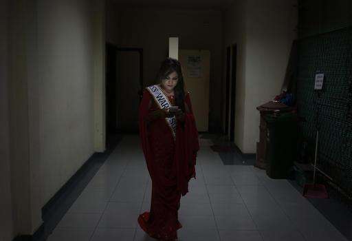 In this Friday, Nov. 11, 2016 photo, a contestants checks her mobile phone during Miss Transgender Indonesia pageant in Jakarta, Indonesia. Opposition from Islamic hardliner groups prevented the long-running event twice in recent years as Indonesia's police often look the other way when they attack or intimidate LGBT groups. (AP Photo/Dita Alangkara)