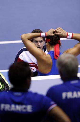 France's Caroline Garcia adjusts her hair while listening to captain Amelie Mauresmo as she plays Czech Republic's Karolina Pliskova during the Fed Cup final in Strasbourg, eastern France, Sunday, Nov. 13, 2016. (AP Photo/Jean-Francois Badias) The Associated Press