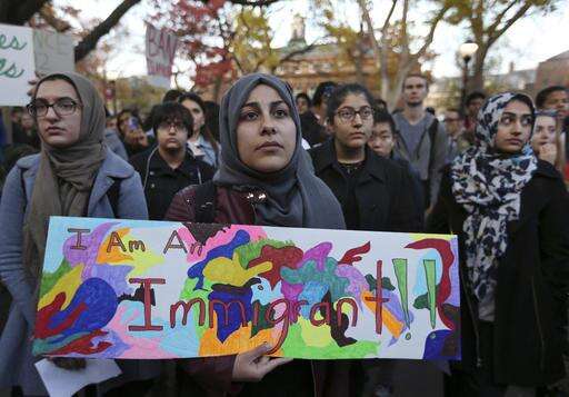 A student holds a sign as she joins a large crowd gathered to protest some of President elect Donald Trump policies and to ask school officials to denounce his plans at Rutgers University Wednesday, Nov. 15, 2016, in New Brunswick, N.J. College students at campuses around the United States say they are planning rallies and walkouts to call on school administrators to protect students and employees against immigration proceedings under Donald Trump's presidency. (AP Photo/Mel Evans)
