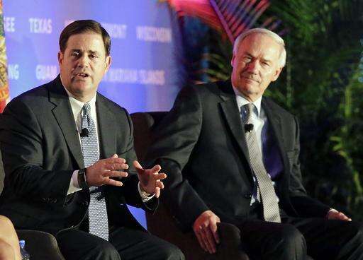 Arizona Gov. Doug Ducey, left, speaks as Arkansas Gov. Asa Hutchinson, right, listens, during a plenary session at the Republican Governors Association annual conference, Tuesday, Nov. 15, 2016, in Orlando, Fla. (AP Photo/John Raoux)