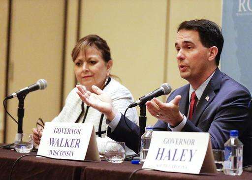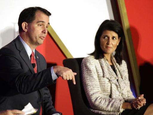 Wisconsin Gov. Scott Walker, left, makes comments as South Carolina Gov. Nikki Haley listens, during a plenary session at the Republican Governors Association annual conference, Tuesday, Nov. 15, 2016, in Orlando, Fla. (AP Photo/John Raoux)