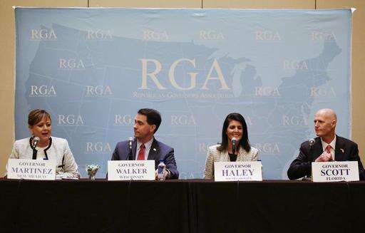 Florida Gov. Rick Scott, front right, speaks during a news conference as from left, New Mexico's Gov. Susana Martinez, Wisconsin's Gov. Scott Walker and South Carolina's Gov. Nikki Haley listen, at the Republican Governors Association annual conference, Tuesday, Nov. 15, 2016, in Orlando, Fla. (AP Photo/John Raoux)