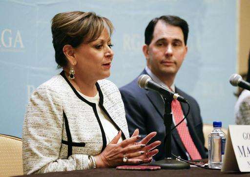 New Mexico Gov. Susana Martinez, left, speaks during a news conference while Wisconsin Gov. Scott Walker looks on, at the Republican Governors Association annual conference, Tuesday, Nov. 15, 2016, in Orlando, Fla. (AP Photo/John Raoux)