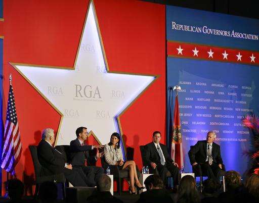 Moderator Bill Bennett, left, hosts a plenary session with, from his left, Wisconsin Gov. Scott Walker, South Carolina Gov. Nikki Haley, Arizona Gov. Doug Ducey and Arkansas Gov. Asa Hutchinson at the Republican Governors Association annual conference, Tuesday, Nov. 15, 2016, in Orlando, Fla. (AP Photo/John Raoux)