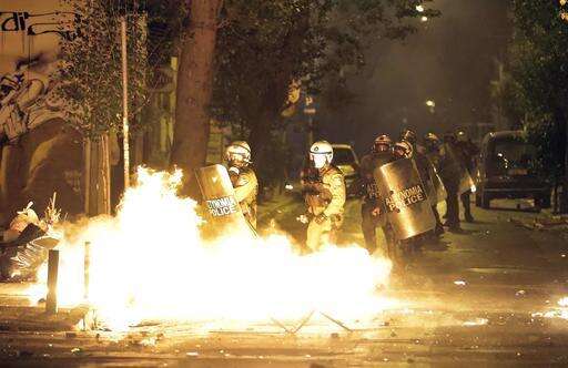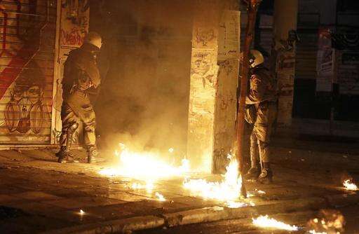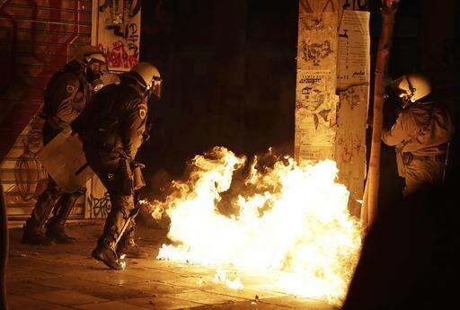 Police officers look at flames from a fire bomb thrown by demonstrators during a protest against the visit of US President Barack Obama in Athens, Tuesday, Nov. 15, 2016. Greek riot police used tear gas and stun grenades in central Athens Tuesday to disperse about 3,000 left-wing marchers protesting a visit by President Barack Obama, after they tried to enter an area declared off-limits to demonstrators. (AP Photo/Thanassis Stavrakis)