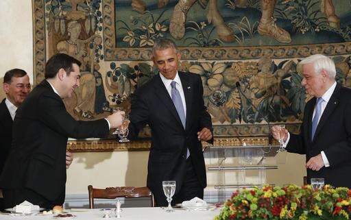 President Barack Obama attends a State Dinner hosted by Greek President Prokopis Pavlopoulos, right, at the Presidential Mansion, Tuesday, Nov. 15, 2016. (AP Photo/Pablo Martinez Monsivais)