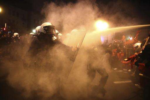 Police and demonstrators clash during a protest against the visit of US President Barack Obama in Athens, Tuesday, Nov. 15, 2016. Greek police say about 3,000 anarchists, leftwing group supporters and students are marching through central Athens, to protest President Barack Obama's visit. (AP Photo/Yorgos Karahalis)