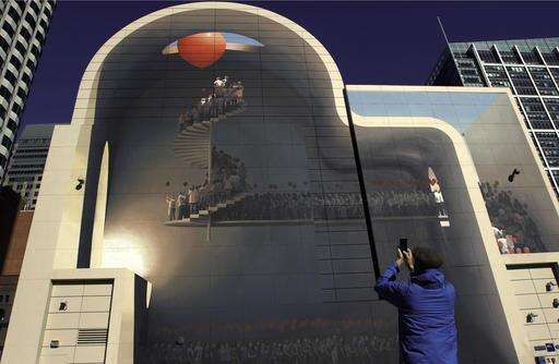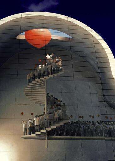 BOSTON (AP) - In a canyon walled by drab gray and brown high-rises, a ragged line of men, women and children hold red helium balloons, ascending a staircase that ends in a spiral at an opening in the roof, where a single giant balloon slips into the blue sky. Two people at the top lift their heads in wonder.