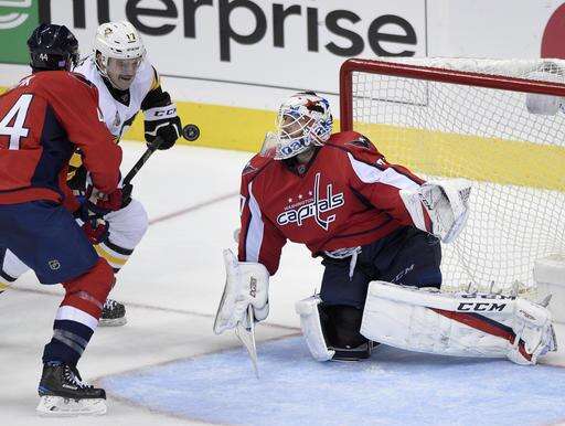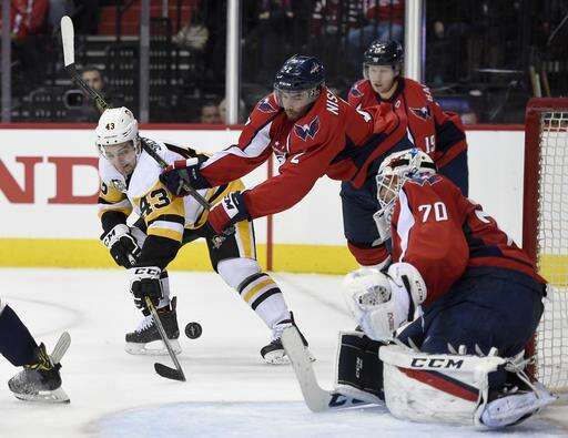Washington Capitals defenseman Matt Niskanen (2) hits Pittsburgh Penguins left wing Conor Sheary (43) with his stick as Washington Capitals goalie Braden Holtby (70) watches the puck during the first period of an NHL hockey game, Wednesday, Nov. 16, 2016, in Washington. (AP Photo/Nick Wass)