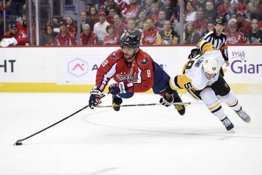 Washington Capitals left wing Alex Ovechkin (8), of Russia, falls to the ice against Pittsburgh Penguins defenseman Kris Letang (58) during the second period of an NHL hockey game, Wednesday, Nov. 16, 2016, in Washington. (AP Photo/Nick Wass)