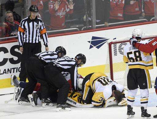 Pittsburgh Penguins goalie Matt Murray (30) lies on the ice after he was injured during the first period of an NHL hockey game against the Washington Capitals, Wednesday, Nov. 16, 2016, in Washington. Murray left the game. (AP Photo/Nick Wass)