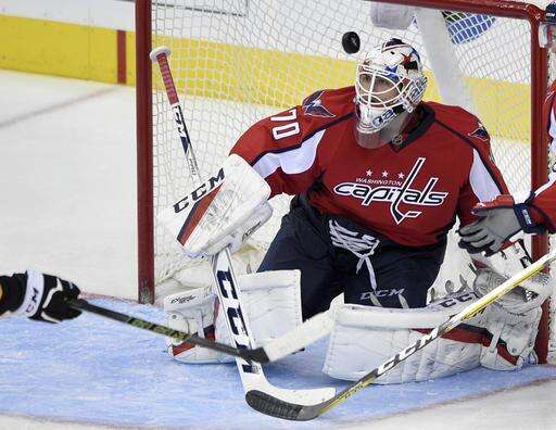 Washington Capitals goalie Braden Holtby (70) watches the puck during the third period of an NHL hockey game against the Pittsburgh Penguins, Wednesday, Nov. 16, 2016, in Washington. The Capitals won 7-1. (AP Photo/Nick Wass)