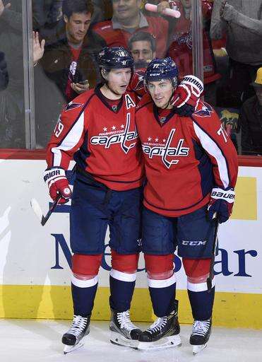 Washington Capitals center Nicklas Backstrom (19), of Sweden, celebrates his goal with T.J. Oshie, right, during the third period of an NHL hockey game against the Pittsburgh Penguins, Wednesday, Nov. 16, 2016, in Washington. The Capitals won 7-1. (AP Photo/Nick Wass)