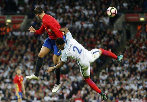 Spain's Alvaro Morata jumps for the ball with England's Nathaniel Clyne, right, during the international friendly soccer match between England and Spain at Wembley stadium in London, Tuesday, Nov. 15, 2016. (AP Photo/Frank Augstein)