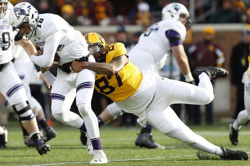 Northwestern quarterback Clayton Thorson is tackled by Minnesota defensive lineman Gaelin Elmore during an NCAA college football game Saturday, Nov. 19, 2016, in Minneapolis. (AP Photo/Stacy Bengs)