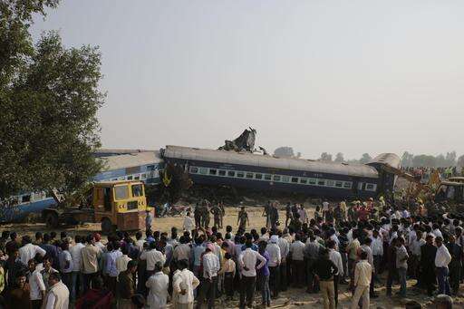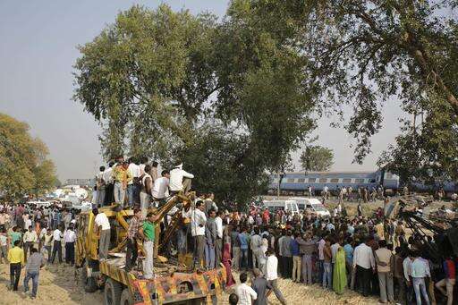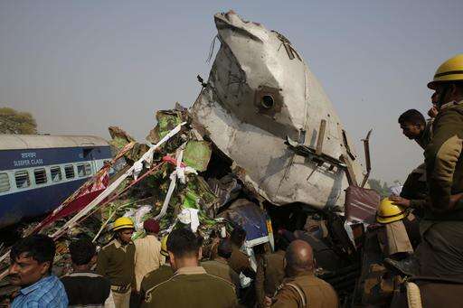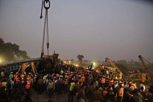 Rescuers use machinery to remove debris after 14 coaches of an overnight passenger train rolled off the track near Pukhrayan village Kanpur Dehat district, Uttar Pradesh state, India, Sunday, Nov. 20, 2016. Dozens were killed and dozens more were injured in the accident. (AP Photo/Rajesh Kumar Singh) The Associated Press