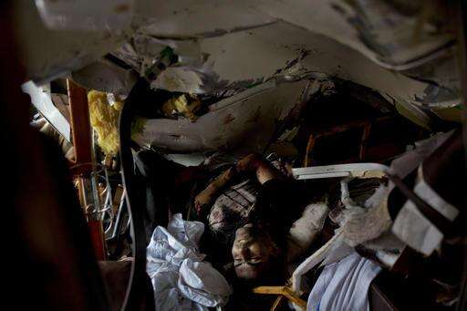 The body of a victim lies buried amid the mangled remains of crashed bogies after 14 coaches of an overnight passenger train rolled off the track near Pukhrayan village,Kanpur Dehat district, Uttar Pradesh state, India, Sunday, Nov. 20, 2016. Dozens were killed and dozens more were injured in the accident. (AP Photo/Rajesh Kumar Singh) The Associated Press