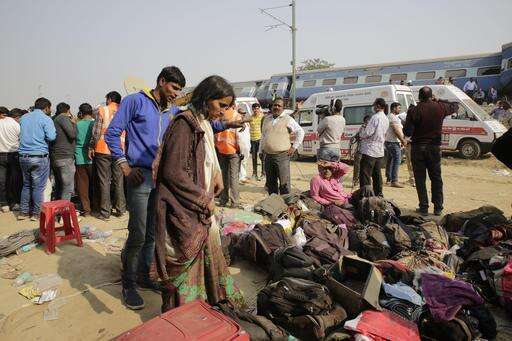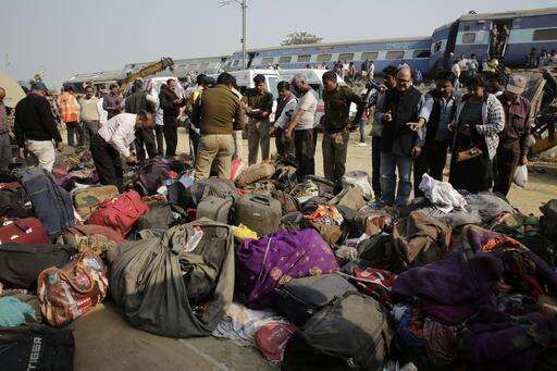 People stand near belongings of passengers after 14 coaches of an overnight passenger train rolled off the track near Pukhrayan village Kanpur Dehat district, Uttar Pradesh state, India, Sunday, Nov. 20, 2016. Dozens were killed and dozens more were injured in the accident. (AP Photo/Rajesh Kumar Singh) The Associated Press