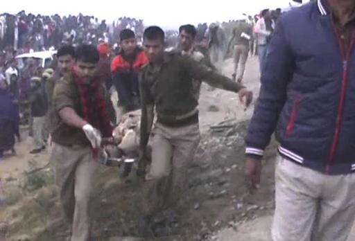 A relative, right, breaks down as rescuers carry the body of a victim after 14 coaches of an overnight passenger train rolled off the track near Pukhrayan village Kanpur Dehat district, Uttar Pradesh state, India, Sunday, Nov. 20, 2016. Dozens were killed and dozens more were injured in the accident. (AP Photo/Rajesh Kumar Singh) The Associated Press