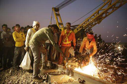 Workers cut a rail track prior to restoring it after 14 coaches of an overnight passenger train rolled off the track near Pukhrayan village Kanpur Dehat district, Uttar Pradesh state, India, Sunday, Nov. 20, 2016. Dozens were killed and dozens more were injured in the accident. (AP Photo/Rajesh Kumar Singh) The Associated Press