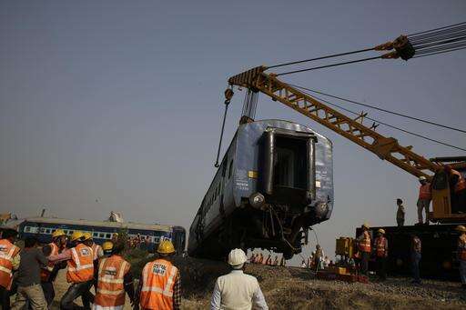 Rescuers lift one of the 14 coaches of an overnight passenger train that rolled off the track near Pukhrayan village Kanpur Dehat district, Uttar Pradesh state, India, Sunday, Nov. 20, 2016. Dozens were killed and dozens more were injured in the accident. (AP Photo/Rajesh Kumar Singh) The Associated Press