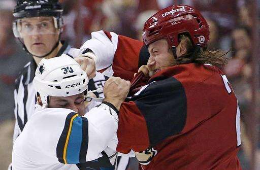 Arizona's Ryan White and San Jose's Michael Haley began exchanging punches off the faceoff right after the goal, with Haley getting in the most vicious hook. Haley leads the Sharks in penalty minutes despite having played in only eight games.