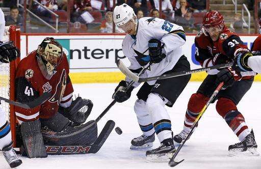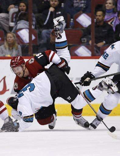 NOTES: Sharks C Tomas Hertl has a lower-body injury and is being evaluated away from the team. Hertl and C Melker Karlsson (ankle) were scratched. ... Coyotes forward Lawson Crouse is dealing with an upper-body injury and was scratched. ... The Coyotes recalled C Christian Dvorak from Tucson before the game. ... Referee Francois St. Laurent left the game after the first period due to illness. ... The Coyotes wore light purple warmup jerseys in honor of Hockey Fights Cancer Night.