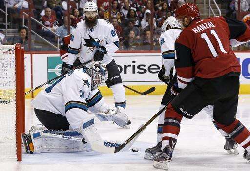Martin Hanzal redirected Alex Goligoski's shot into the net at 1:16 of overtime, giving the Coyotes a 3-2 win over the San Jose Sharks.