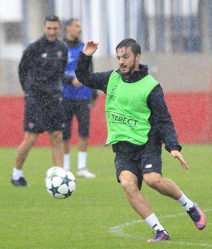 Sevilla's Pablo Sarabia exercises with other team members during the last training session prior to the Champions League Group H match against Juventus in Seville, Spain, Monday, Nov. 21, 2016. Sevilla wants to show it's ready to reach the next level in European football. After three straight titles in the second-tier Europa League, the Spanish club wants to start thriving among the best in the continent. (AP Photo/Miguel Morenatti) The Associated Press