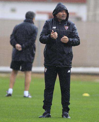 Sevilla's coach Jorge Sampaoli looks at his player during the last training session prior to the Champions League Group H match against Juventus in Seville, Spain, Monday, Nov. 21, 2016. Sevilla wants to show it's ready to reach the next level in European football. After three straight titles in the second-tier Europa League, the Spanish club wants to start thriving among the best in the continent. (AP Photo/Miguel Morenatti) The Associated Press
