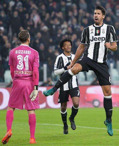 Juventus's Sami Khedira, right, celebrates after he scored, during the Serie A soccer match between Juventus and Pescara, at the Juventus Stadium in Turin, Italy, Nov. 19, 2016. (Alessandro Di Marco/ANSA via AP) The Associated Press