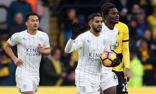 Leicester City's Riyad Mahrez, second left, celebrates scoring against Watford during the English Premier League soccer match at Vicarage Road, Watford, England, Saturday Nov. 19, 2016. (Steven Paston/PA via AP) The Associated Press