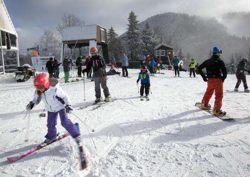 Skiers get ready to take the first run of the season on top of the mountain on opening day at Loon Mountain ski resort Wednesday, Nov. 23, 2016, in Lincoln, N.H. Many ski areas in Northern New England plan to open for the Thanksgiving weekend. (AP Photo/Jim Cole) The Associated Press