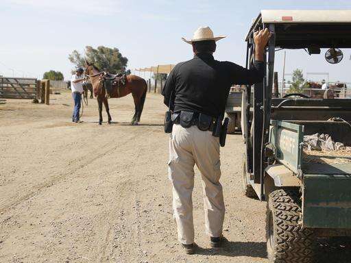 In this Nov. 2, 2016, photo, retired Sacramento County Sheriff Thomas Neri keeps an eye on inmates working at the Wild Horse Program run at the Sacramento County Sheriff's Department's Rio Cosumnes Correctional Center in Elk Grove, Calif. Inmates spend 40 hours a week training mustangs provided by the federal Bureau of Land Management. (AP Photo/Rich Pedroncelli) The Associated Press