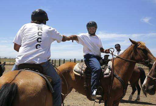 In this July 15, 2016, photo, inmate Ron Gitchell, right, receives congratulations from fellow inmate Dax Poplawski after passing a training test at the Wild Horse Program run at the Sacramento County Sheriff's Department's Rio Cosumnes Correctional Center in Elk Grove, Calif. Once-wild horses and unbridled jail inmates are helping each other through the program aimed at preparing both for society. (AP Photo/Rich Pedroncelli) The Associated Press