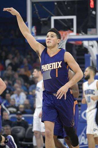 Phoenix Suns guard Devin Booker (1) reacts after scoring a three-point basket during the first half of an NBA basketball game against the Orlando Magic in Orlando, Fla., Wednesday, Nov. 23, 2016. (AP Photo/Phelan M. Ebenhack)