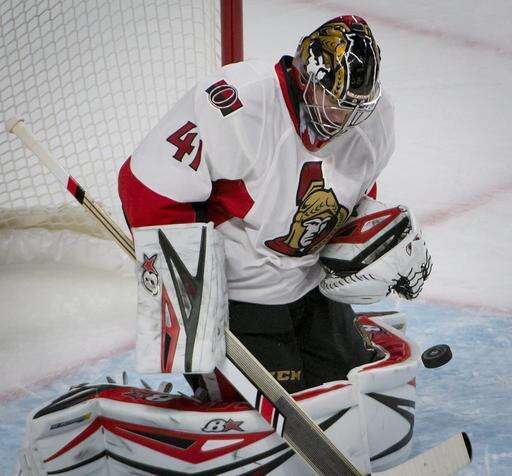 Ottawa Senators goalie Craig Anderson stops a shot during the first period of an NHL hockey game against the Montreal Canadiens, Tuesday, Nov. 22, 2016 in Montreal. (Peter McCabe/The Canadian Press via AP) The Associated Press