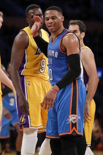 Oklahoma City Thunder guard Russell Westbrook walks away from Los Angeles Lakers forward Luol Deng during the first half of an NBA basketball game, Tuesday, Nov. 22, 2016, in Los Angeles. (AP Photo/Ryan Kang) The Associated Press