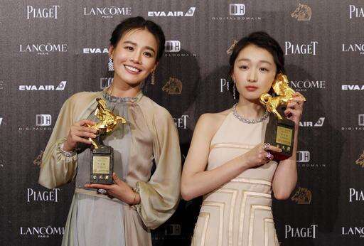 Chinese actress Zhou Dongyu, right, and Ma Sichun hold their award for Best Leading Actress at the 53rd Golden Horse Awards in Taipei, Taiwan, Saturday, Nov. 26, 2016. They won for the film "Soul Mate" at this year's Golden Horse Awards -the Chinese-language film industry's biggest annual events. (AP Photo/Billy Dai)