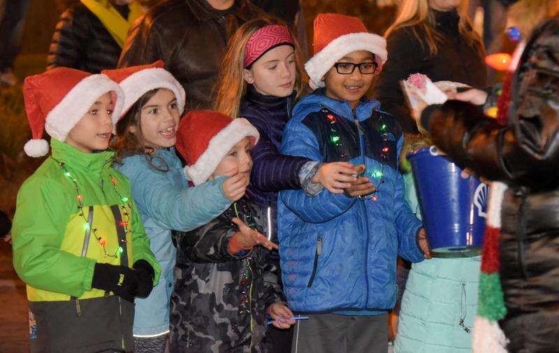 Children decked out in Santa hats look to get some of the candy being passed out during the annual Little Friends Holiday Parade of Lights in Naperville on Sunday. Mark Black/mblack@dailyherald.com