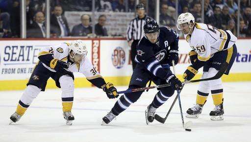 Winnipeg Jets' Mark Scheifele (55) breaks into the Nashville Predators' zone between Viktor Arvidsson (38) and Roman Josi (59) during second period NHL hockey action in Winnipeg, Manitoba, Sunday, Nov. 27, 2016. (Trevor Hagan/The Canadian Press via AP) The Associated Press