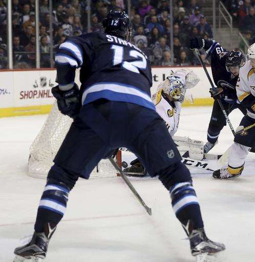Winnipeg Jets' Drew Stafford (12) watches as his wrap around shot beats Nashville Predators goaltender Juuse Saros (74) to open the scoring during second period NHL hockey action in Winnipeg, Manitoba, Sunday, Nov. 27, 2016. (Trevor Hagan/The Canadian Press via AP) The Associated Press