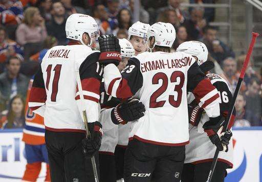 Radim Vrbata also scored to help the Coyotes complete a home-and-home sweep. They edged the Oilers in a shootout Friday night in the desert. The Coyotes have won three of their last four to improve to 8-10-2.