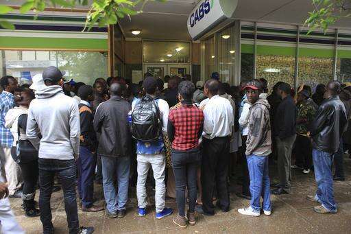 Zimbabweans wait in a bank queue following the introduction of new notes by the Reserve Bank of Zimbabwe in Harare, Monday, Nov, 28, 2016. The Southern African nation has rolled out a new currency for the first time since 2009 in hopes of easing biting shortages of the US dollar. Banks across the country started issuing the new currency called bond notes, Monday. (AP Photo/Tsvangirayi Mukwazhi) The Associated Press