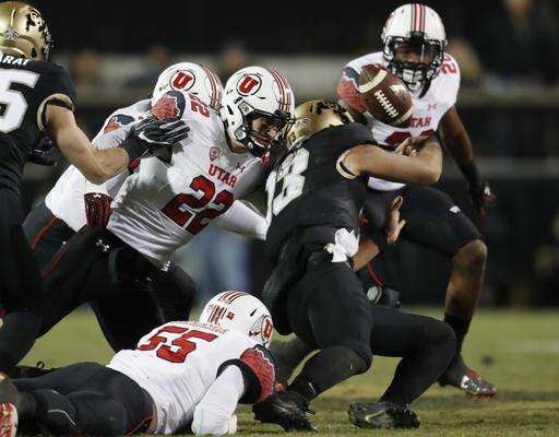 Colorado quarterback Sefo Liufau, third from left, fumbles the ball as he is hit by, from left, Utah linebacker Donavan Thompson and defensive back Chase Hansen as defensive back Marcus Williams, back, comes in to pursue the loose ball in the second half of an NCAA college football game Saturday, Nov. 26, 2016, in Boulder, Colo. Colorado won 27-22. (AP Photo/David Zalubowski) The Associated Press