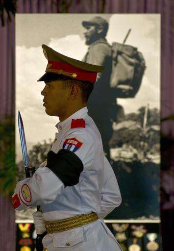 Inside the memorial, thousands walked through three rooms with near-identical displays featuring the 1962 Alberto Korda photograph of the young Castro in the Sierra Maestra mountains, bouquets of white flowers and an array of Castro's medals against a black backdrop, framed by honor guards of soldiers and children in school uniforms. The ashes of the 90-year-old former president did not appear to be on display.