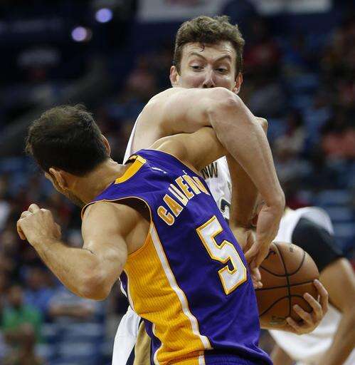 New Orleans Pelicans center Omer Asik battles for a rebound with Los Angeles Lakers guard Jose Calderon (5) in the first half of an NBA basketball game in New Orleans, Tuesday, Nov. 29, 2016. (AP Photo/Gerald Herbert) The Associated Press