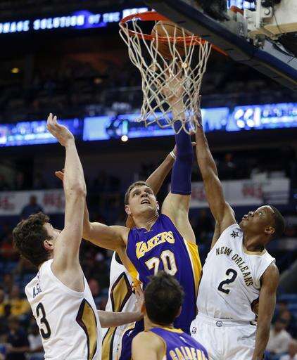 Los Angeles Lakers center Timofey Mozgov (20) goes to the basket between New Orleans Pelicans center Omer Asik (3) and guard Tim Frazier (2) in the first half of an NBA basketball game in New Orleans, Tuesday, Nov. 29, 2016. (AP Photo/Gerald Herbert) The Associated Press